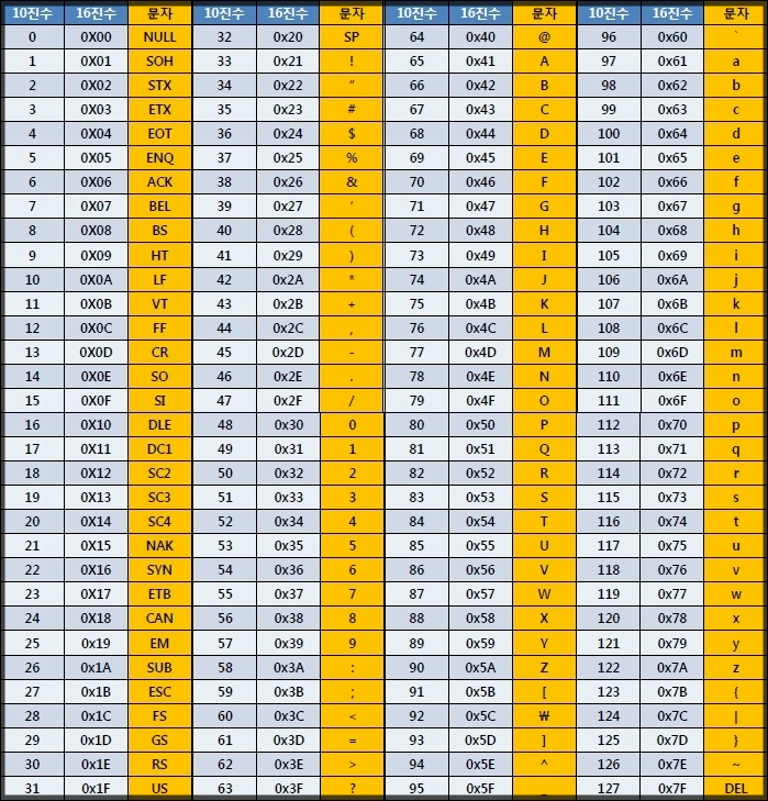 위 사진은 아스키 코드 값을 확인할 수 있는 아스키 코드 표 이다.