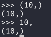 값 한개를 괄호로 묶으면 튜플이 아니라 그냥 값이 된다. 요소가 한개인 튜플을 만드려면 값을 괄호로 묶고 콤마를 붙이거나 괄호없이 콤마만 붙여도 된다.