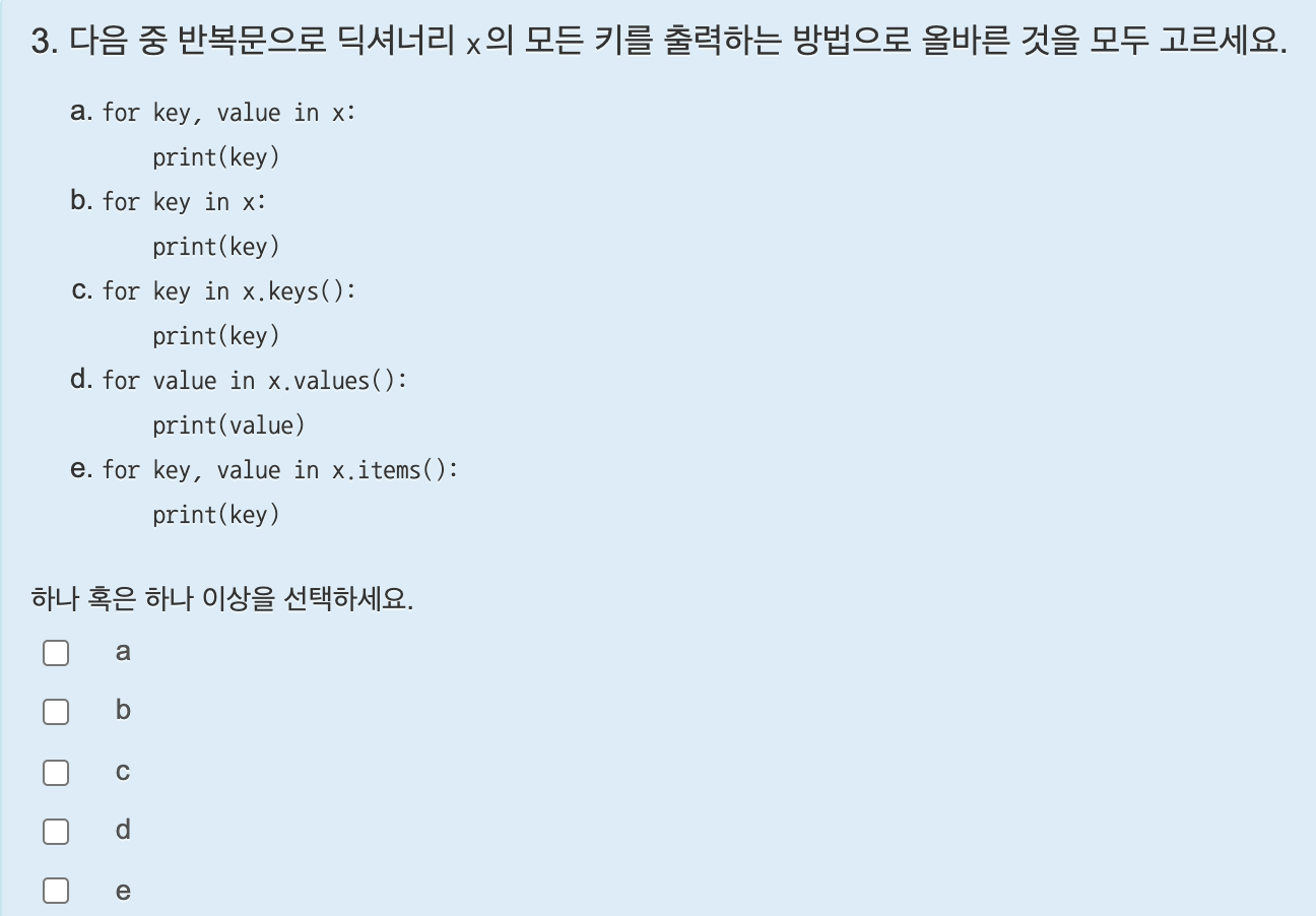 정답은 b,c이다. setdefault는 키만 지정하면 값은 None가 되고, keys는 키만 가져온다.