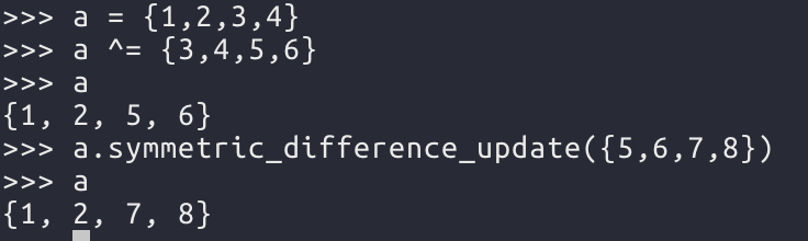 ^= 와 symmetric_difference_update()메서드는 현재 세트와 다른 세트중 겹치지 않는 요소만 현재 세트에 저장한다.