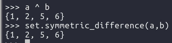 ^연산자와 set.symmetric_difference()메서드는 대칭 차집합을 구한다. 대칭 차집합은 xor연산자의 특성을 그대로 따라 두 집합중 겹치지 않는 요소만 포함한다.