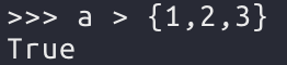 > 은 현재 세트가 다른 세트의 진상위집합인지 확인한다. 같은 기능을 하는 메서드는 없다. 진상위집합은 상위집합이지만 두 집합이 같지 않을 때 참이다.