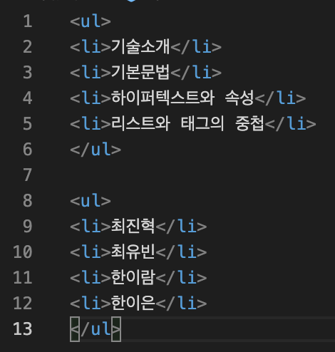 서로 성격이 같은 태그들을 다음과 같이 <ul>태그로 묶으면 <ul>태그로 묶인 태그끼리 구분할 수 있다.