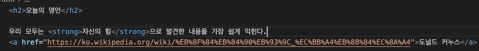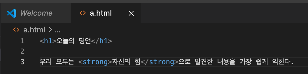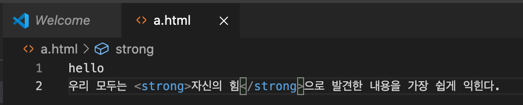 <strong> </strong>안에 있는 내용은 글씨가 굵게 강조되어 표시된다. 이러한 것들을 태그라 그러고, <strong>를 시작태그 , </strong>를 닫히는 태그라 한다. 시작 태그에서 닫히는 태그 안에 있는 내용을 강조하는 것이다.