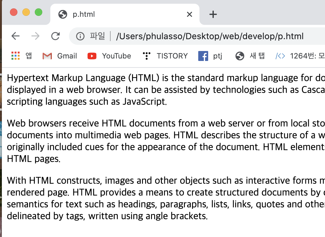 p 태그를 사용하면 웹 페이지에서 단락을 구분할 수 있다. 단락간의 간격은 CSS를 통해서 변경시킬 수 도 있다.