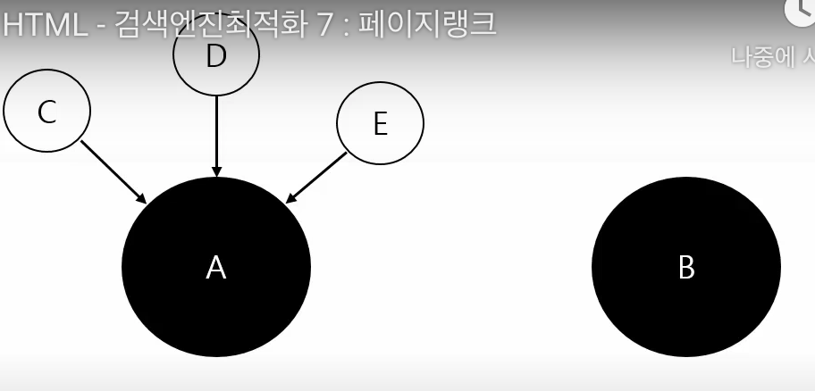 A와 B라는 두 사이트가 있고, 다음과 같이 A사이트를 링크하고 있는 다른 사이트들이 많지만, B사이트를 링크하고 있는 다른 사이트 들은 없을 때 페이지 랭크의 순위는 A가 더 높아진다.
