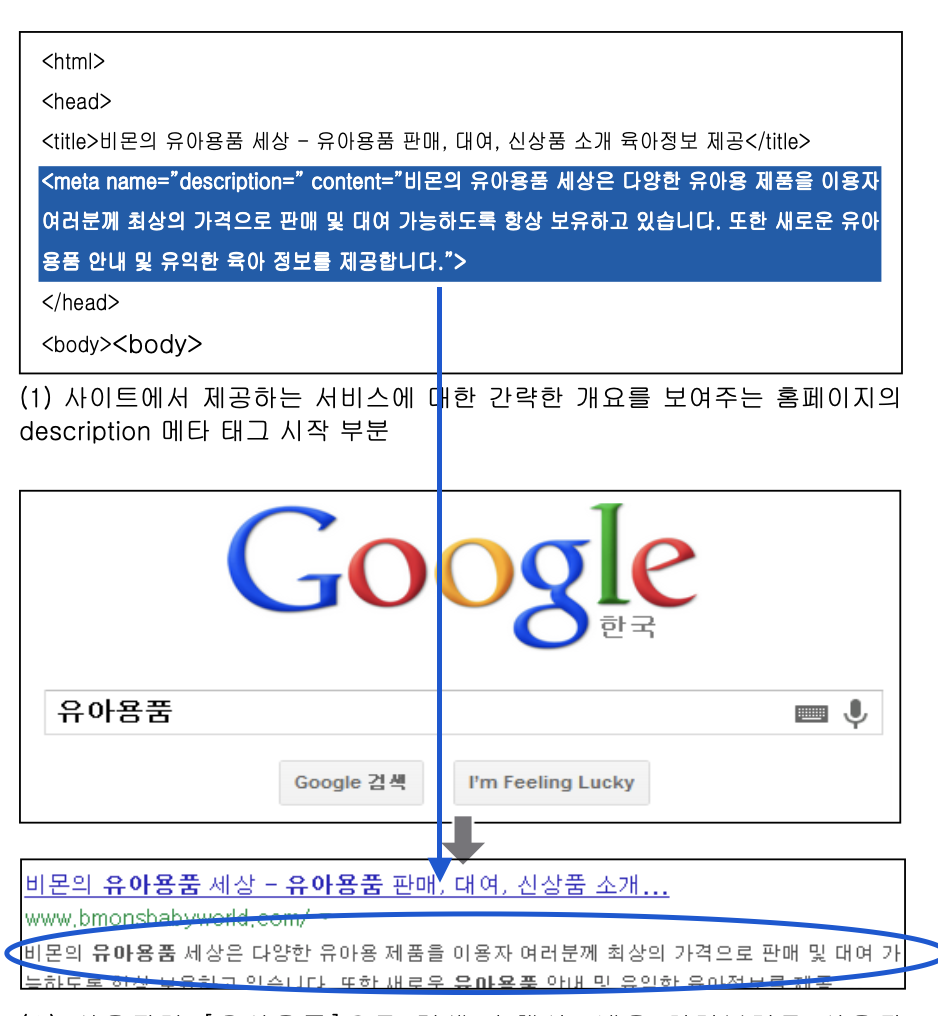 meta태그의 description 속성을 사용하면 검색 결과의 본문 내용에서 meta태그의 내용이 포함될 수 있다.