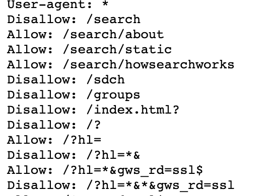 위의 robots.txt는 구글의 것이다. 구글도 로봇의 접근을 허용하는 페이지들은 Allow로, 허용하지 않는 페이지들은 Disallow로 표시하고 있다.
