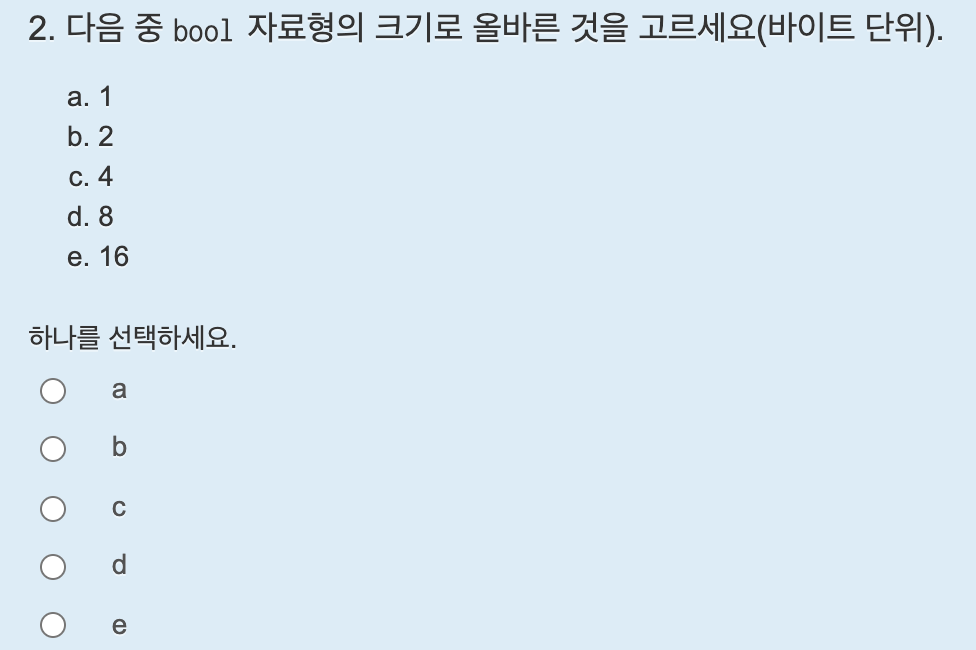int 와 bool 자료형의 크기는 다음과 같다.