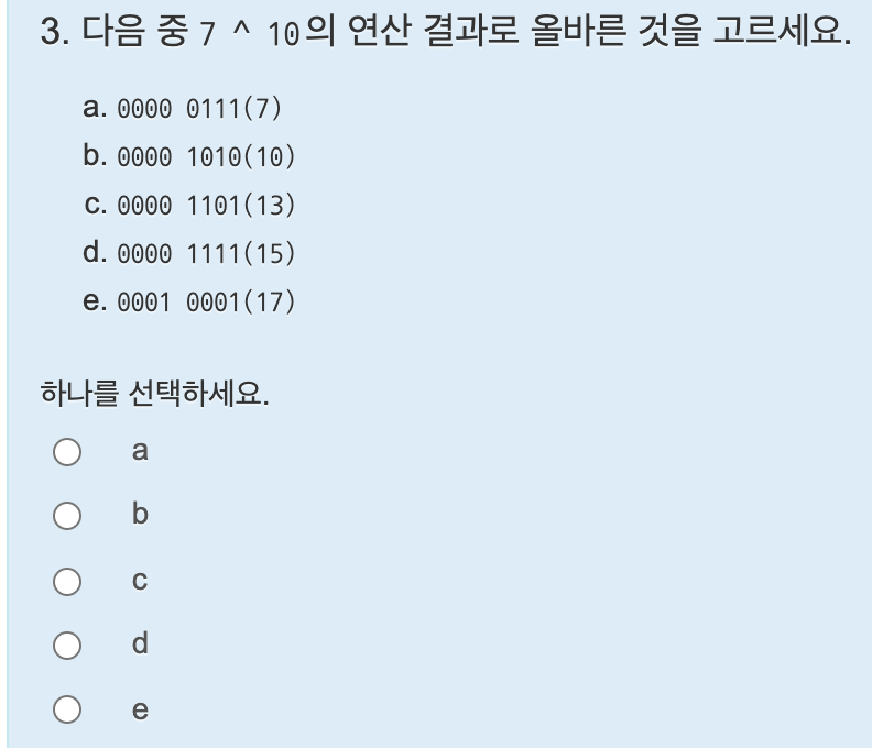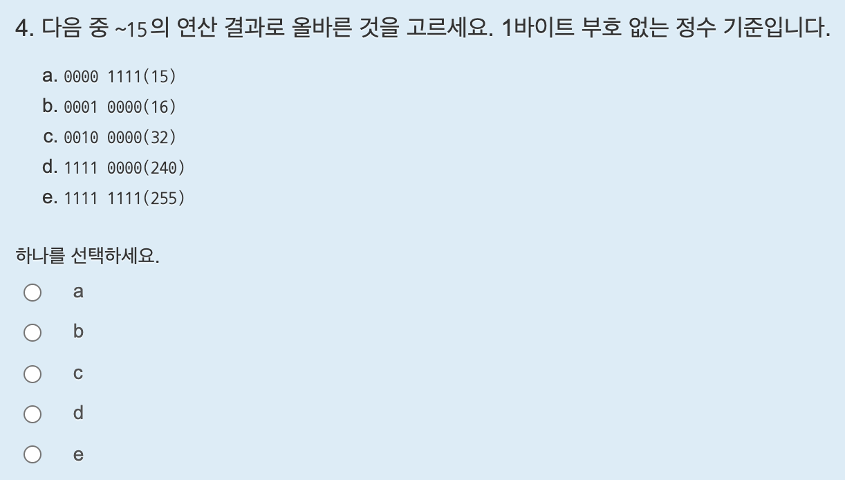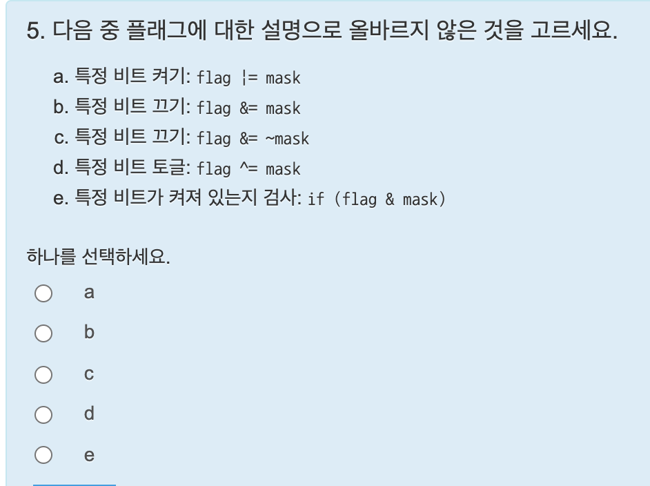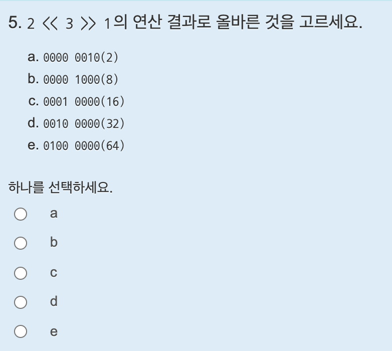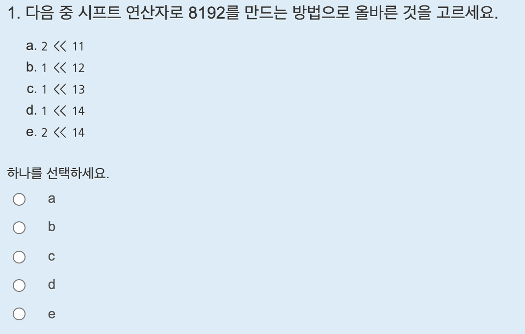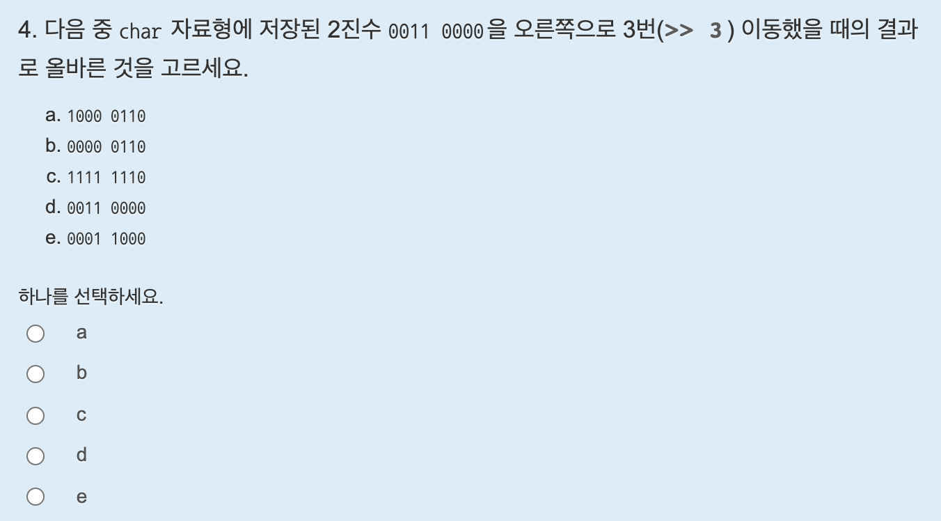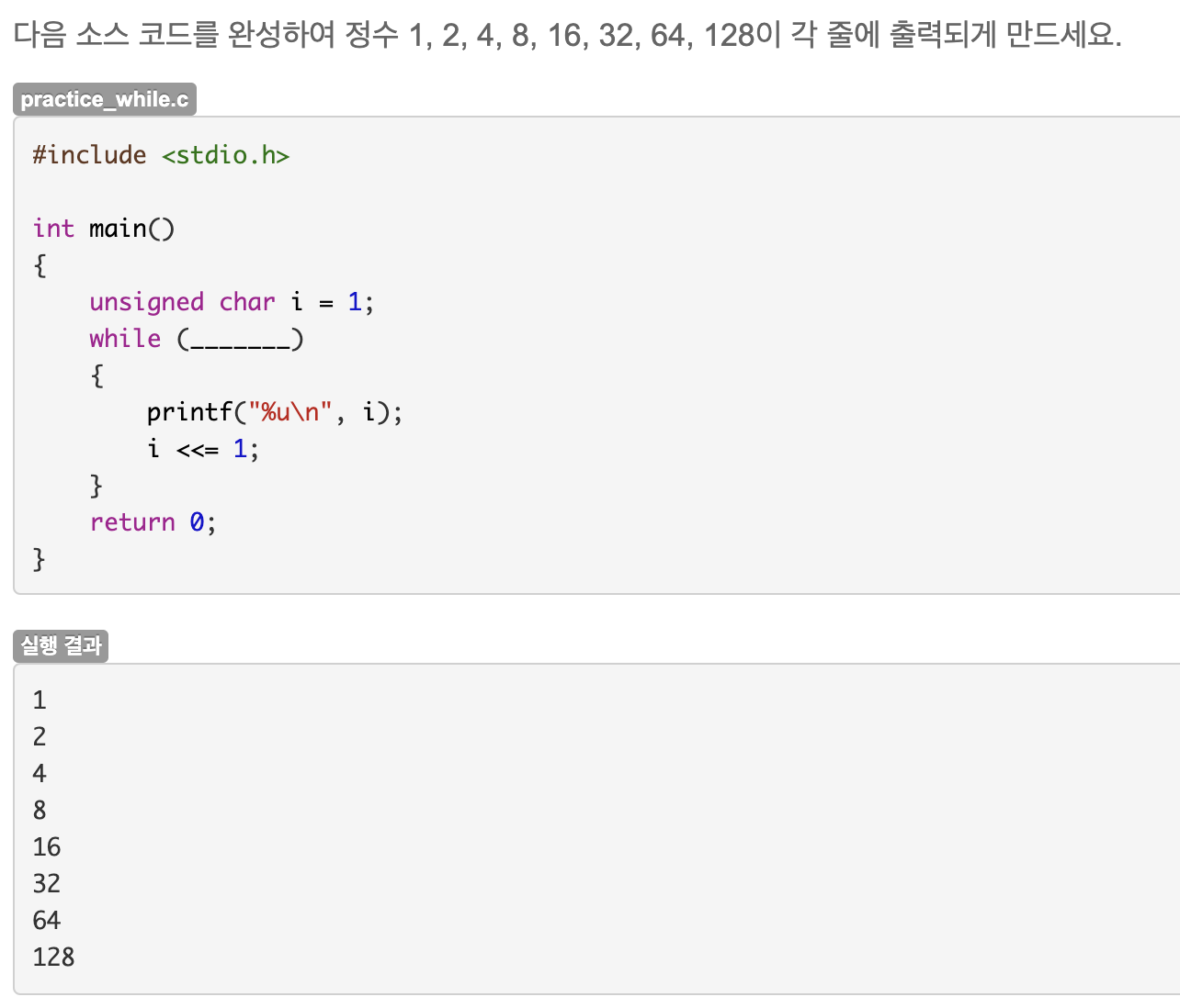 i 변수는 8비트 이므로 i는 1에서 1칸씩 계속 왼쪽으로 시프트하다보면 1000 0000은 128 이고, 0000 0000이 되므로 i는 0일때 반복문을 종료시키면 된다. 답은 i != 0 이다.