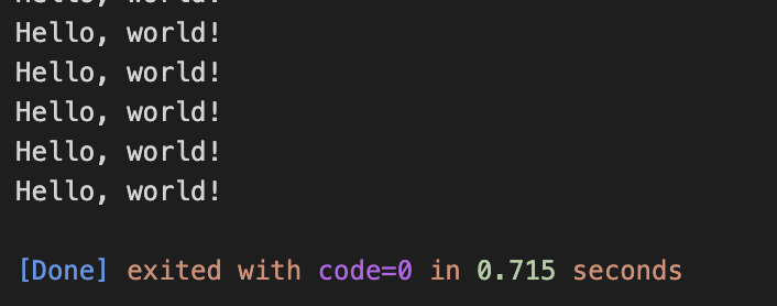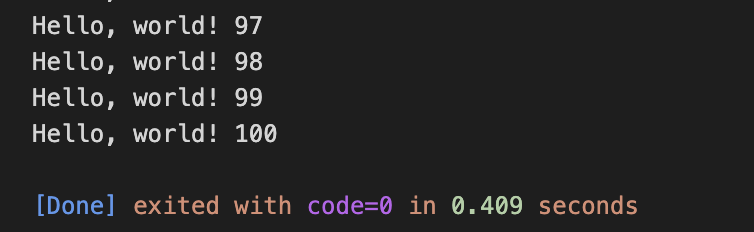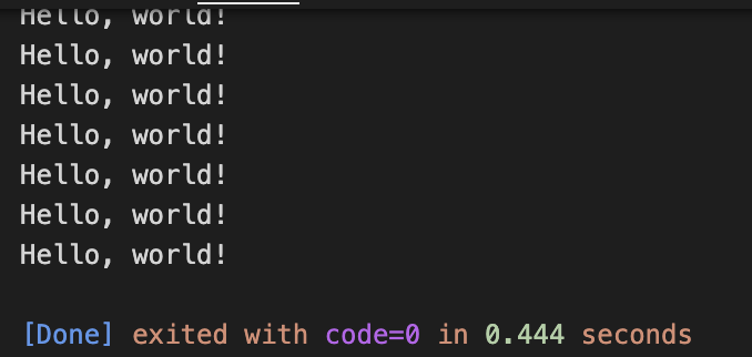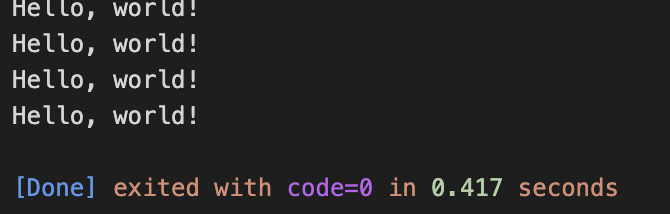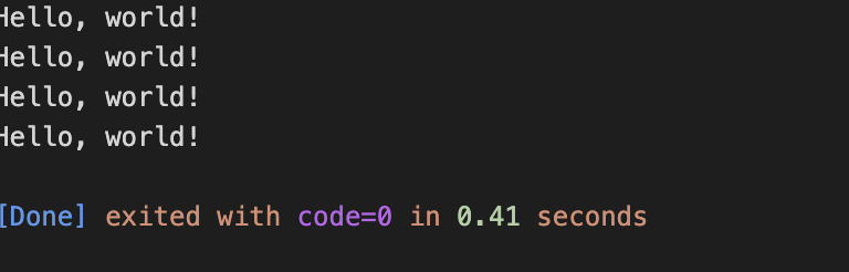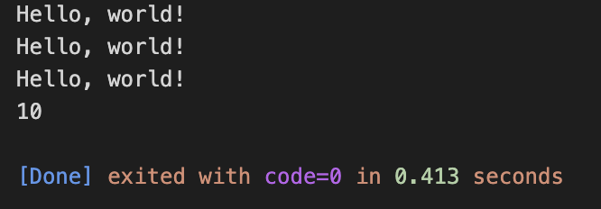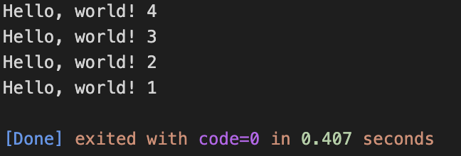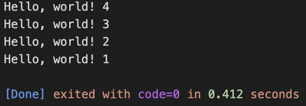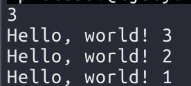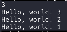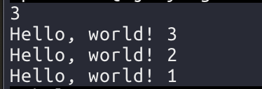 입력값을 받아서 count에 저장하고, i가 count보다 작을때까지 반복했다. 3을 입력했으므로 Hello world!는 3번 출력된다.