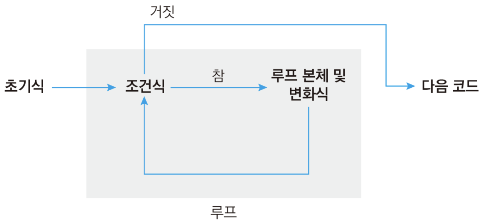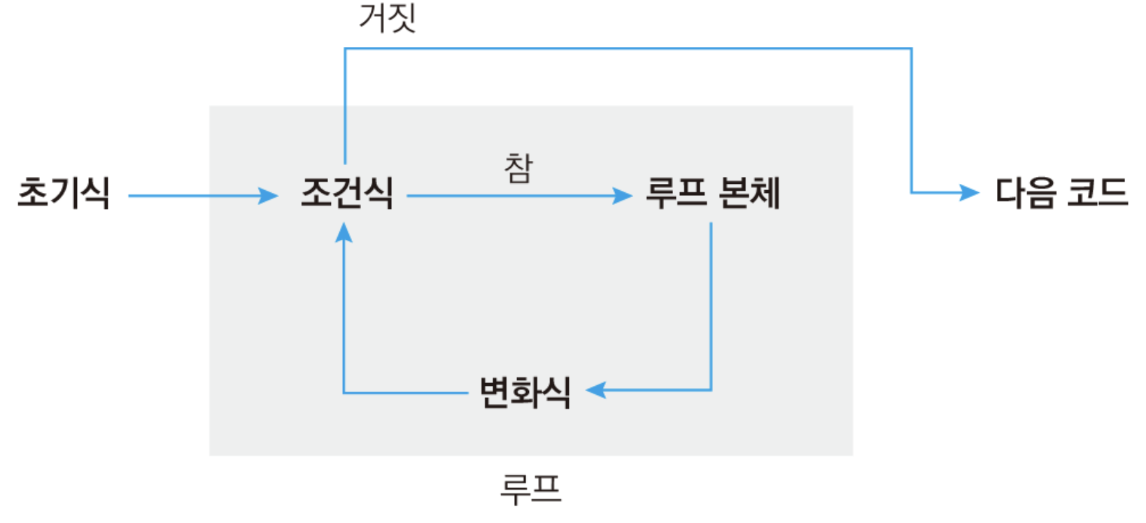 초기식부터 시작하여 조건식을 판별한다. 조건식이 참이면 반복할 코드와 변화식을 수행한다. 그리고 다시 조건식을 판별하여 참이면 코드를 계속 반복하고, 거짓이면 반복문을 끝낸 뒤 다음 코드를 실행한다.
