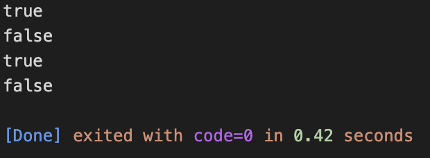 true, false를 출력하려면 다음과 같이 삼항연산자를 이용할 수 있다. 삼항연산자는 값의 참/거짓도 판단할 수 있어서 불 값이 들어있는 변수를 그대로 사용하면 된다. 서식지정자 없이 그대로 출력해도 되고, %s 서식지정자를 이용해도 된다.