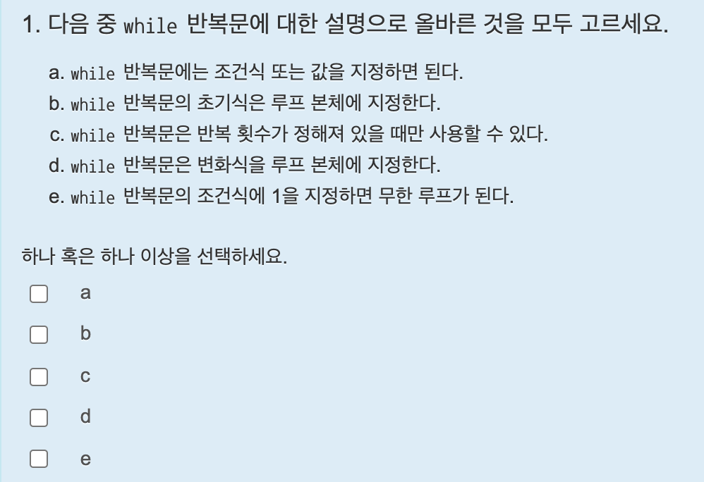 while 반복문은 괄호 안에 조건식만 들어가고, 초기식은 반복문 바깥에 있다. 중괄호 안에는 반복할 코드와 변화식이 들어간다.