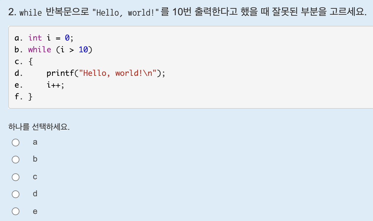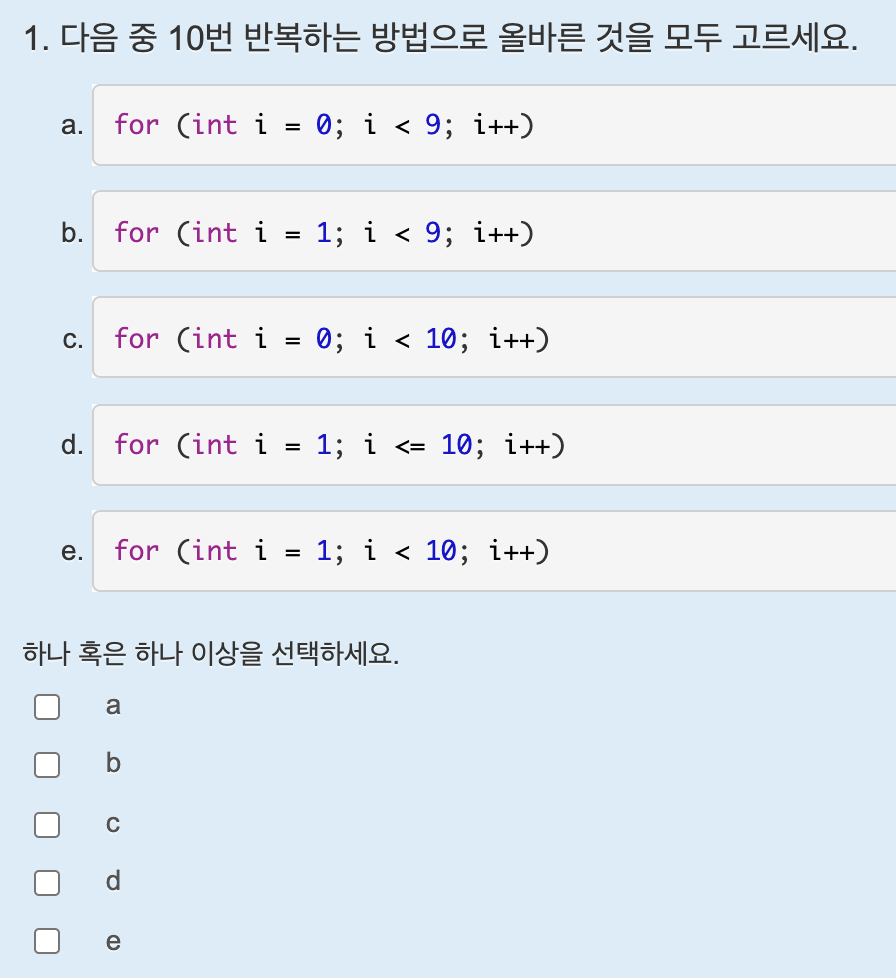 정답은 b이다. i < 10 이여야 한다.