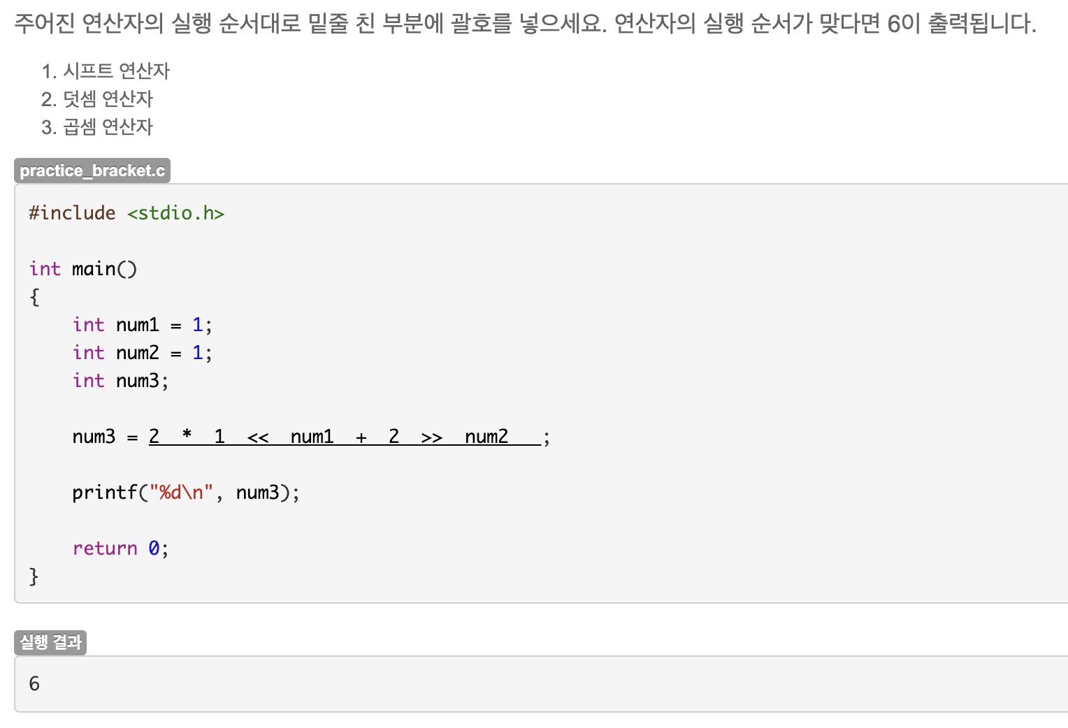 0000 0011 (3)의 경우 num1 << 3 으로 왼쪽으로 3번 이동하여 0001 1000 (24) 가 되었다.