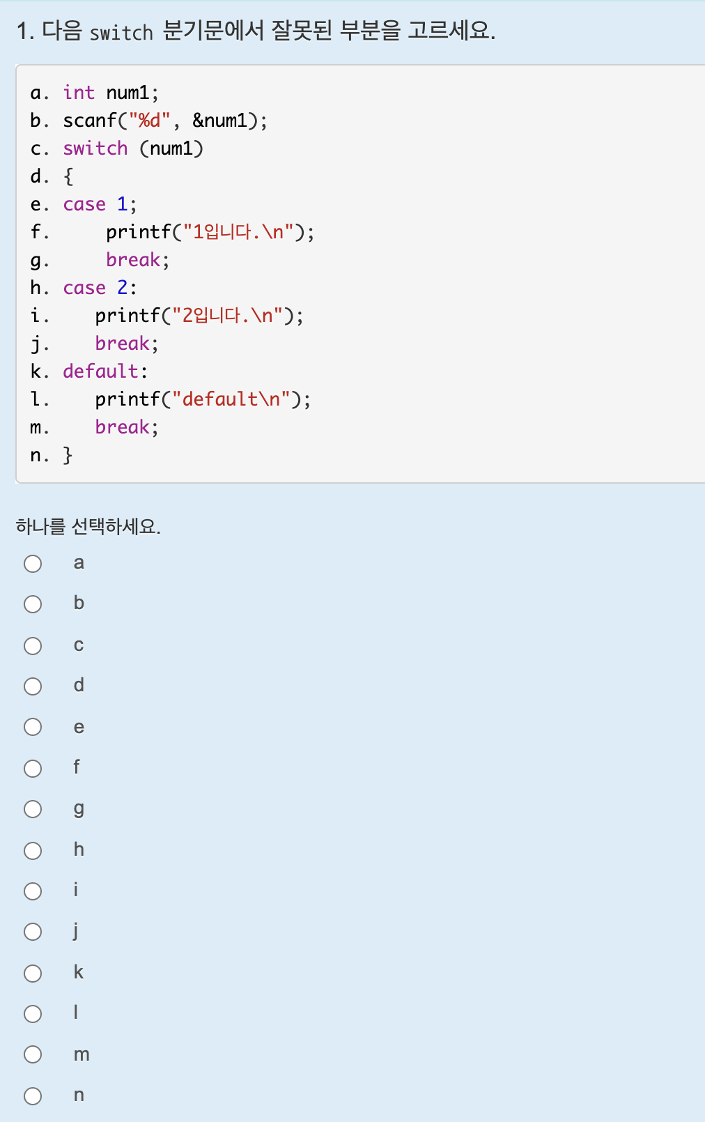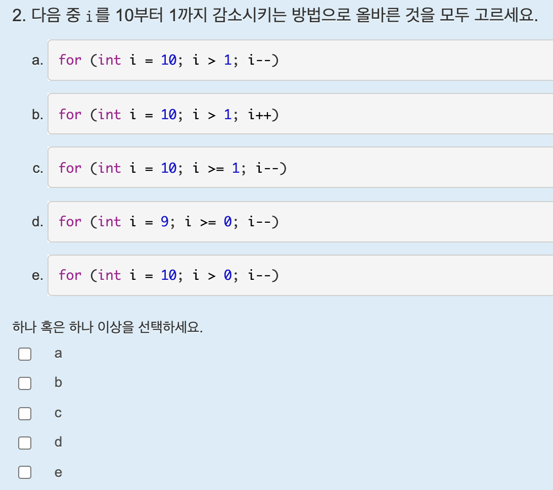 정답은 b이다. for문 뒤에는 세미클론이 오면 안된다.