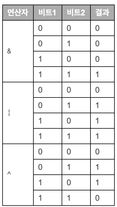 다음은 &, |, ^ 연산자로 각 비트를 연산했을 때의 결과(진리표) 이다.