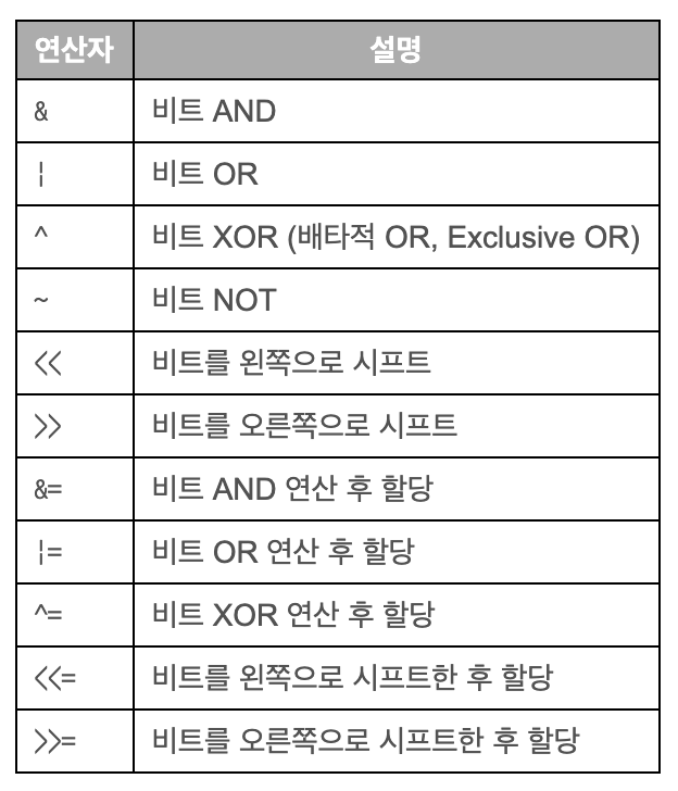 비트 연산자의 종류는 다음과 같다.