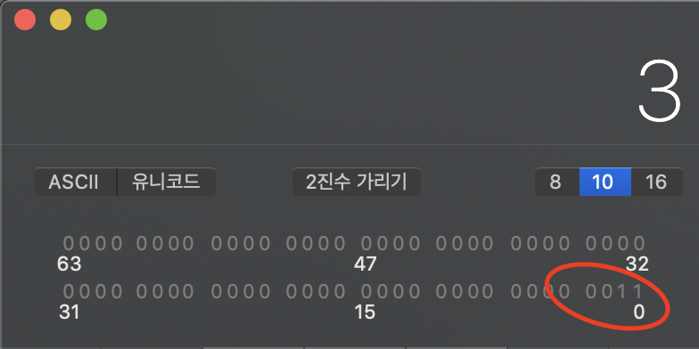 10진수 3을 2진수로 표현하면 0011 인것을 확인할 수 있다.