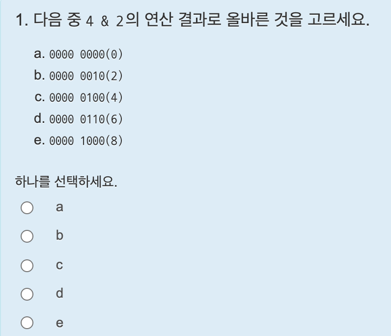 &연산자는 두 비트가 모두 1일때 1이다. 하나라도 0이면 0이 된다. 따라서 0000 0001 (10진수 1)과 0000 0011 (10진수 3)을 &연산하면 0000 0001 (10진수 1)이 된다.
