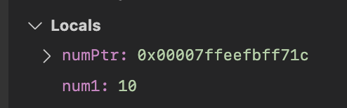 위 코드에서 8번째 줄까지 실행한 상태이다. 포인터 변수 numPtr에 num1의 주소가 저장되있다. Locals 창에서 > 을 클릭하면 현재 메모리 주소에 저장된 값을 확인할 수 있다.