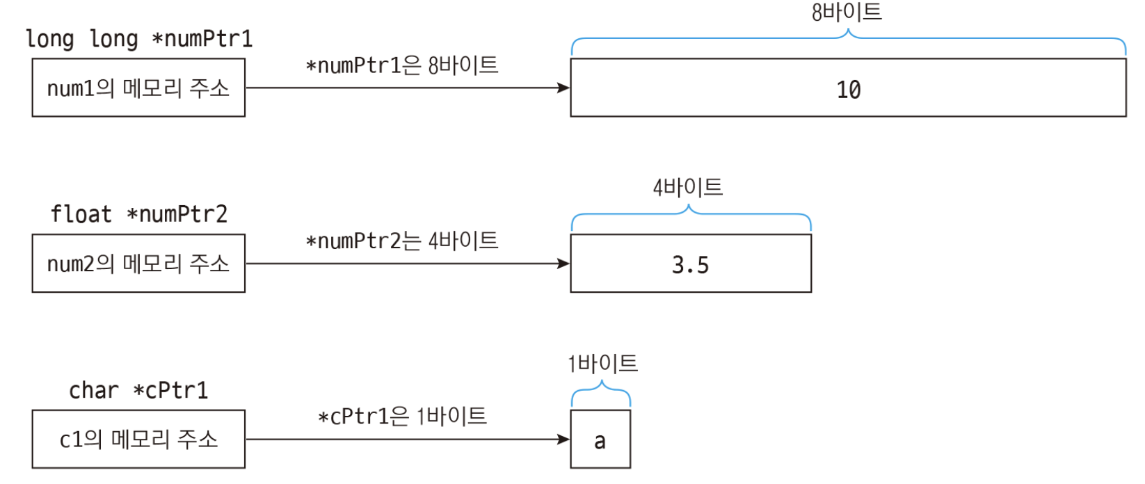 포인터에서 저장되는 메모리 주솟값은 정수형으로 동일하지만 선언하는 자료형에 따라 메모리에 접근하는 방법이 달라진다. 다음과 같이 포인터를 역참조 할 때 자료형의 크기에 맞게 값을 가져오거나 저장한다.