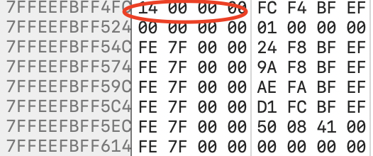 0A가 14로 바뀌었다. 16진수 14는 10진수로 20이다. 역참조후 20을 할당하여 메모리의 내용이 바뀐 것을 확인할 수 있다.