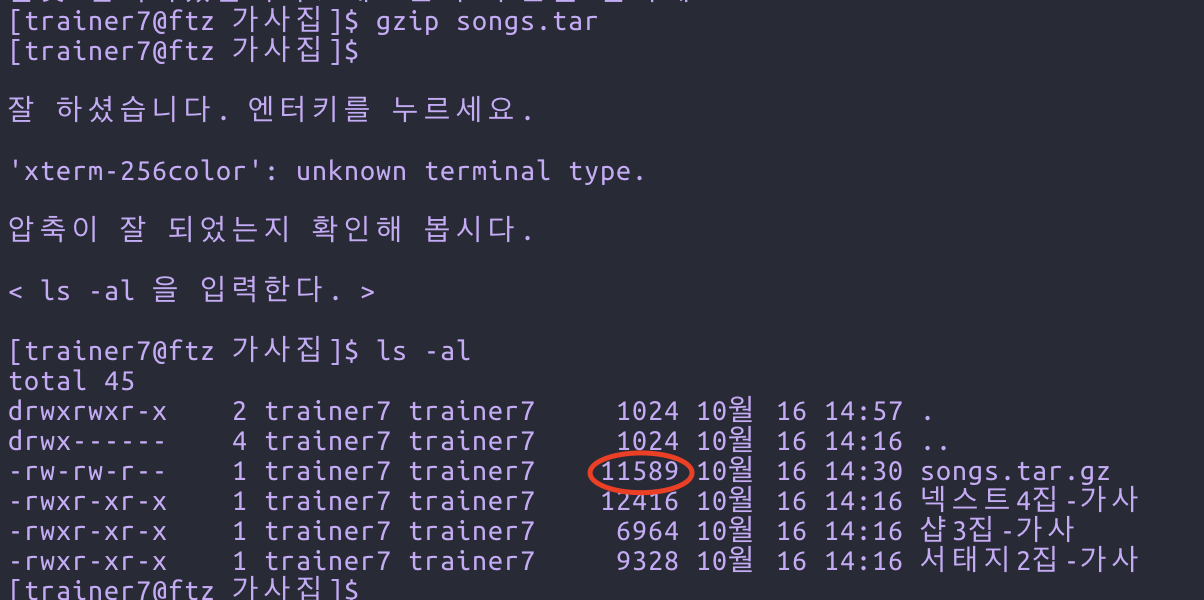 위 만들어진 파일의 용량 부분을 보면 3개의 파일을 뭉쳤는데 용량은 오히려 더 증가하였다. tar은 압축하지 않고, 파일을 합쳐버리기만 할 때 사용된다. 또한 gzip은 한 번에 한개의 파일만 압축할 수 있기 때문에 여러개의 파일을 압축하려면 tar로 파일을 합친 뒤 압축해야 한다.