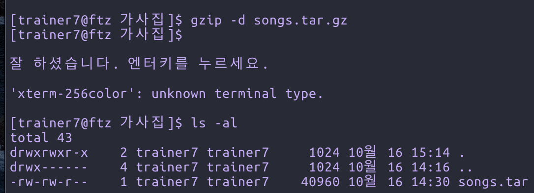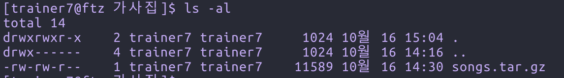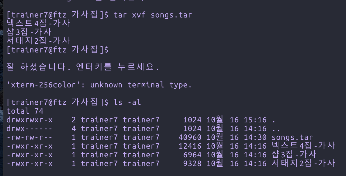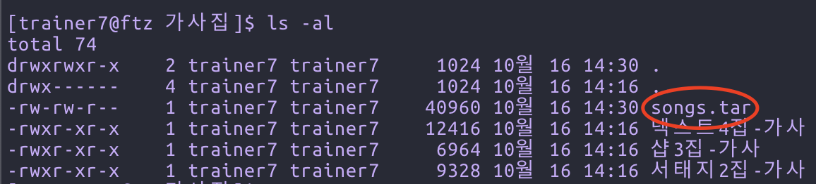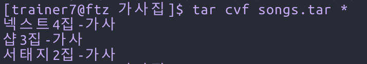 위 명령은 현재 디렉토리의 모든 파일(*)을 songs.tar 이라는 이름으로 합친 것이다.