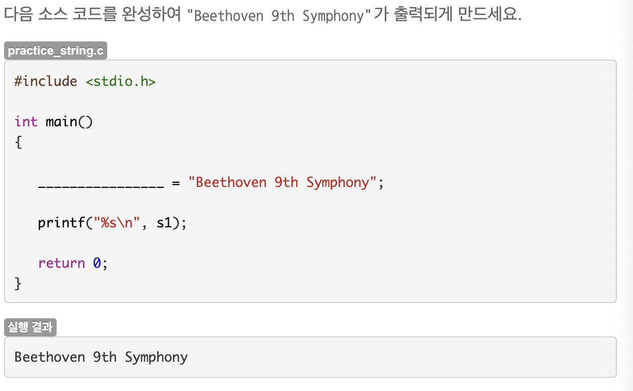 배열을 선언할 때는 배열의 크기를 할당할 문자열보다 크게 지정해야 한다. 문자열 문자 개수보다 배열의 크기가 작다면 컴파일은 되지만 문자열이 제대로 출력되지 않는다. 문자열은 마지막에 NULL이 꼭 들어가야 하므로 문자 개수에 하나 더한 크기가 문자열을 저장할 수 있는 배열의 최소 크기 이다.