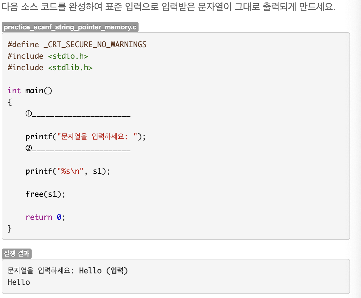 char 10개 크기 만큼 동적 메모리를 할당하여 입력값을 문자열 포인터 s1에 저장할 수 있다. 입력 받을 때 s1은 포인터이므로 &를 붙이지 않는다. 문자열 사용이 끝나면 free 함수로 메모리를 해제해야 한다. 문자열 중간에 공백이 있다면 문자열 포인터에는 공백 직전까지만 저장된다.