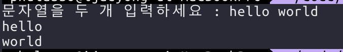 문자열 두 개를 저장하기 위한 공간을 선언하고, scanf 함수에서 서식지정자로 %s를 두 개 넣어준다. 문자열이 저장될 배열을 두 개 넣어주면 공백으로 구분된 문자열을 입력받을 수 있다. 문자열을 더 입력받고 싶으면 %s와 입력받을 배열(또는 문자열 포인터)의 개수를 늘려주면 된다.