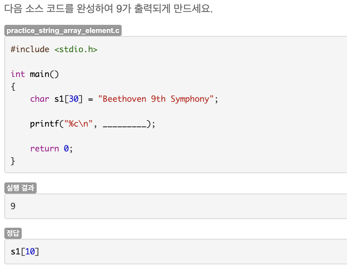 배열을 인덱스로 접근하면 char과 같기 때문에 %c로 출력할 수 있다. 배열로 저장된 문자열 맨 뒤에는 NULL이 있어 출력값에는 보이지 않는다.