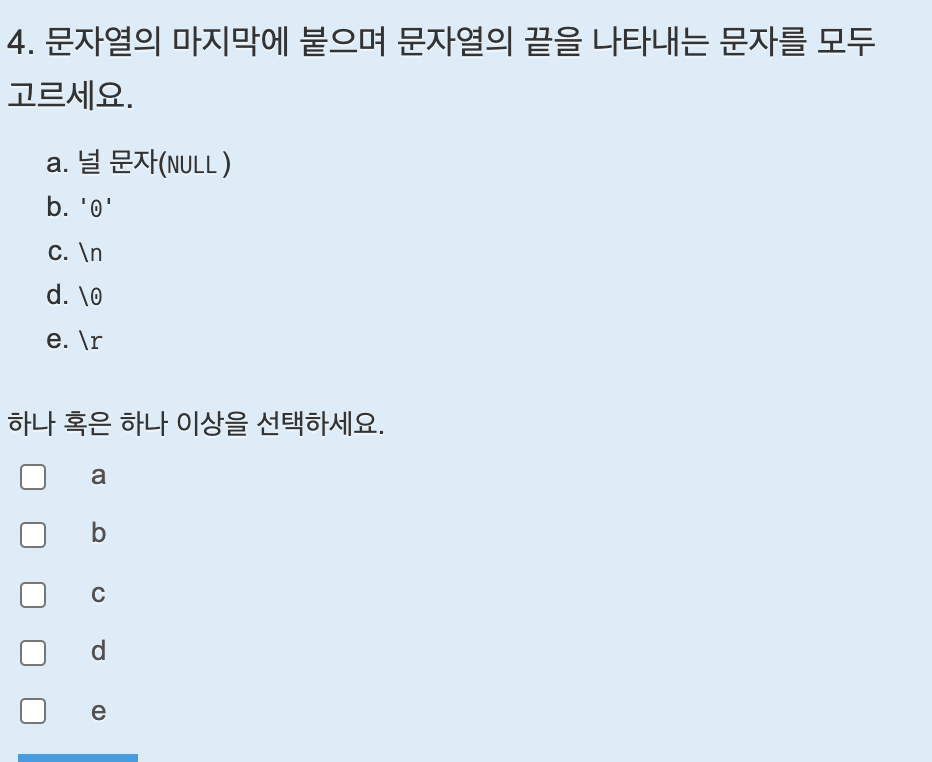 C에서 문자열은 마지막 끝에 항상 널문자가 붙는다. NULL은 0으로 표현할 수 있으며 문자열의 끝을 나타낸다.