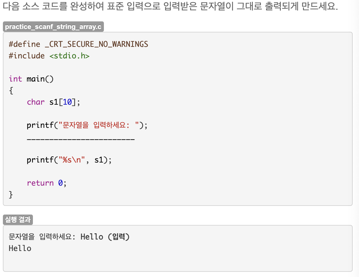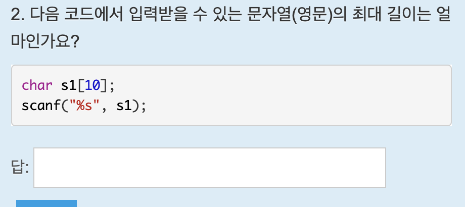 scanf 함수에 서식지정자로 %s를 넣어서 문자열을 입력받을 수 있다. 매개변수는 입력값을 저장할 배열을 넣는데, 배열 앞에는 일반 변수와 달리 &를 붙이지 않는다. 위 코드에서는 크기가 10인 배열을 선언했으므로 문자열 맨 뒤에 붙는 널문자 까지 포함하여 총 10개의 문자를 저장할 수 있다. 따라서 실제 저장할 수 있는 문자는 9개이다.