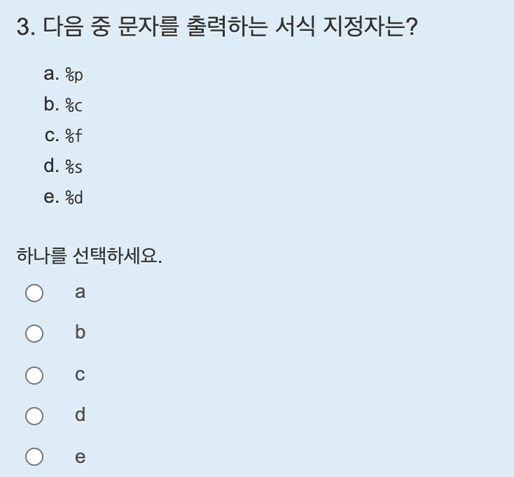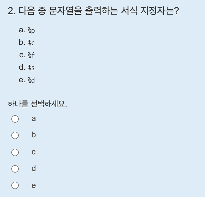 문자 하나를 출력할 때는 %c 서식지정자를 사용하며 맨 뒤 문자열인 5번째 인덱스를 가져오면 NULL 이기 때문에 출력해도 화면에 표시되지 않는다.