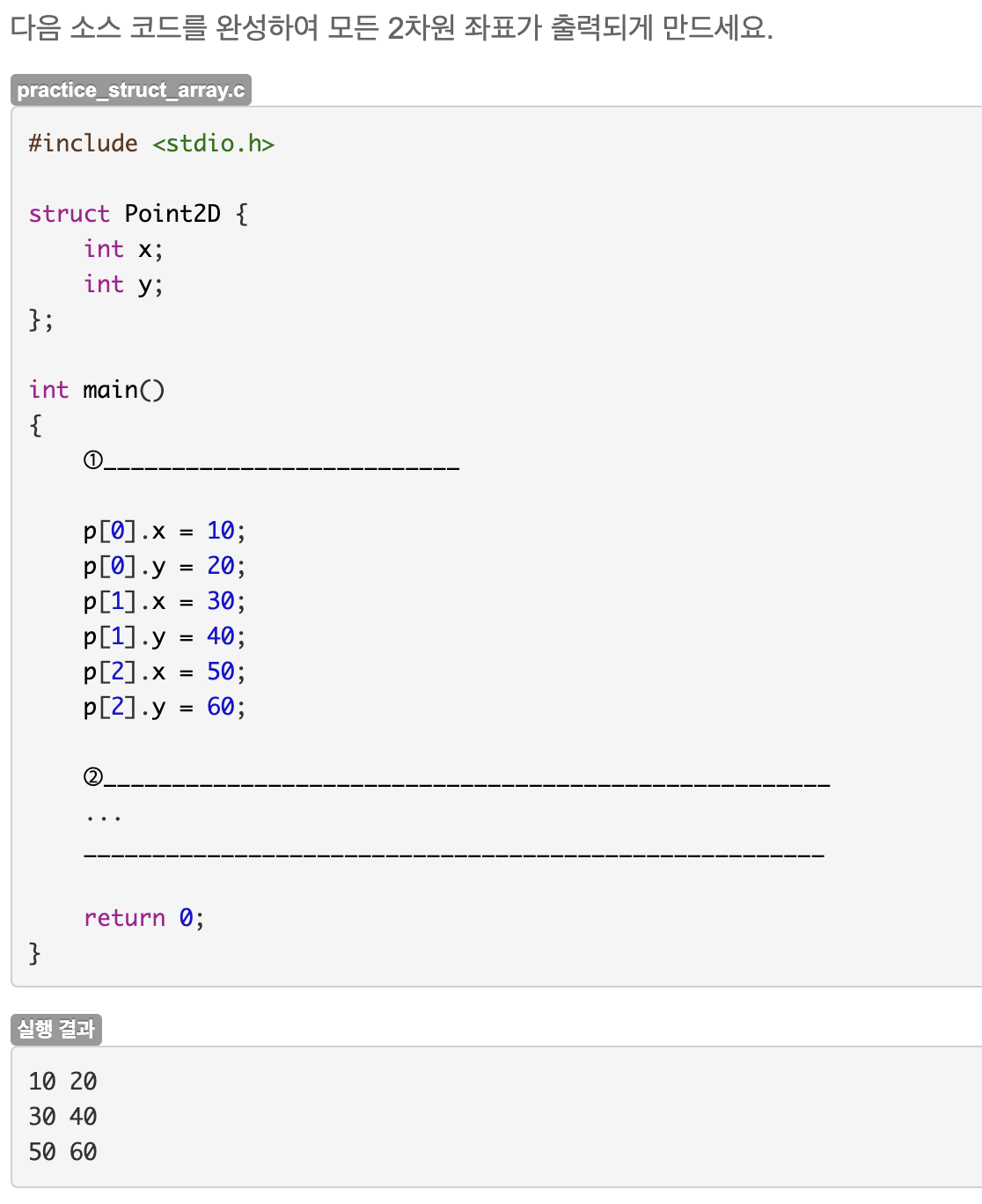 - struct구조체이름 변수이름[크기] = { { 값1, 값2 }, { 값3, 값4 } };