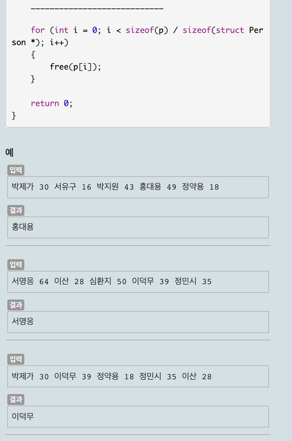 가장 큰 나이의 인덱스를 저장할 변수를 만들고, 배열 길이만큼 반복하면서 메모리를 할당하고, 할당한 메모리에 값을 입력받는다. 입력받은 나이가 저장되어있던 인덱스의 나이보다 크면 현재 인덱스를 저장한다. 반복문이 끝나면 저장된 인덱스에 해당한는 이름을 출력한다.