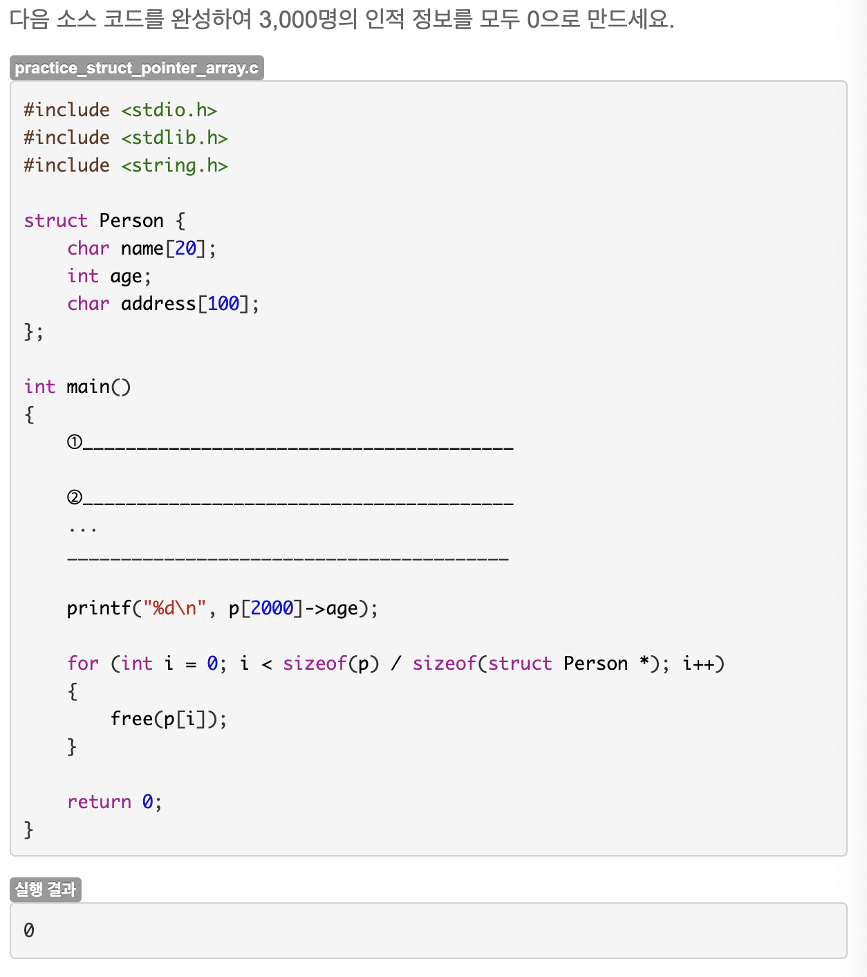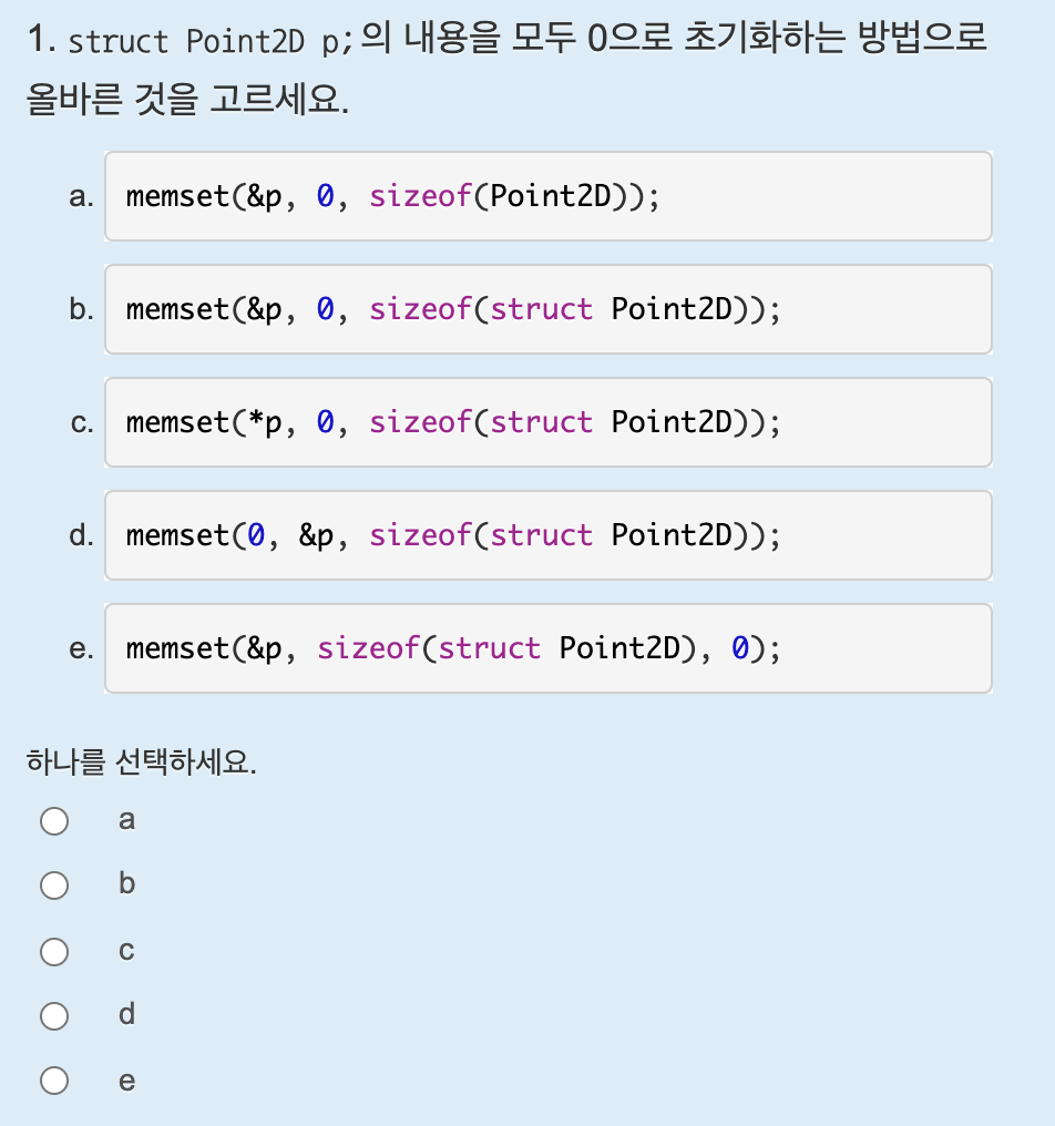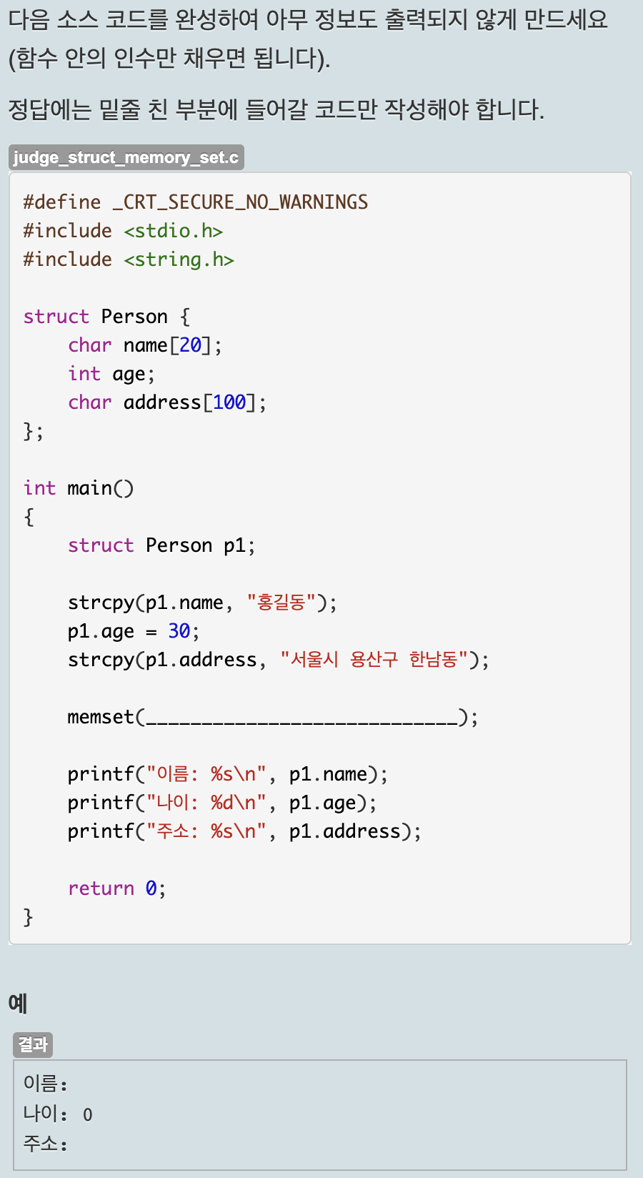 출력했을 때 아무 정보도 나오지 않도록 하려면 모든 멤버를 0으로 초기화해야 하므로 정답은 &p1, 0, sizeof(struct Person)이다.