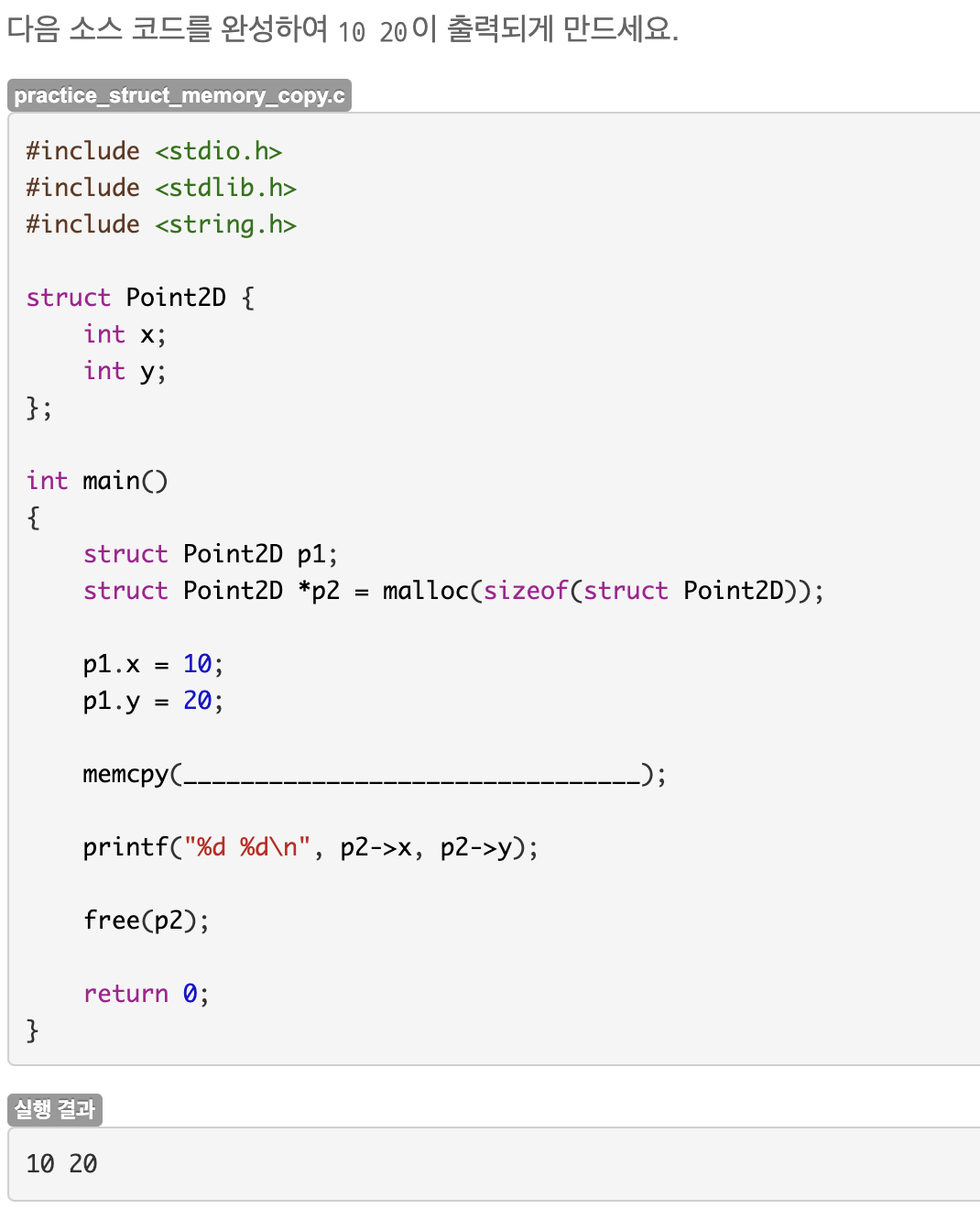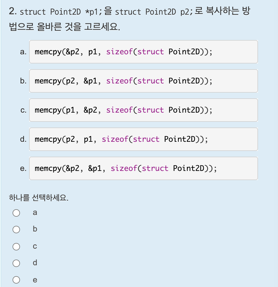 p2는 구조체 변수이므로 주소 연산자를 사용해서 p1의 값을 복사해와야 한다. 정답은 &p2, p1, sizeof(struct Person) 이다.