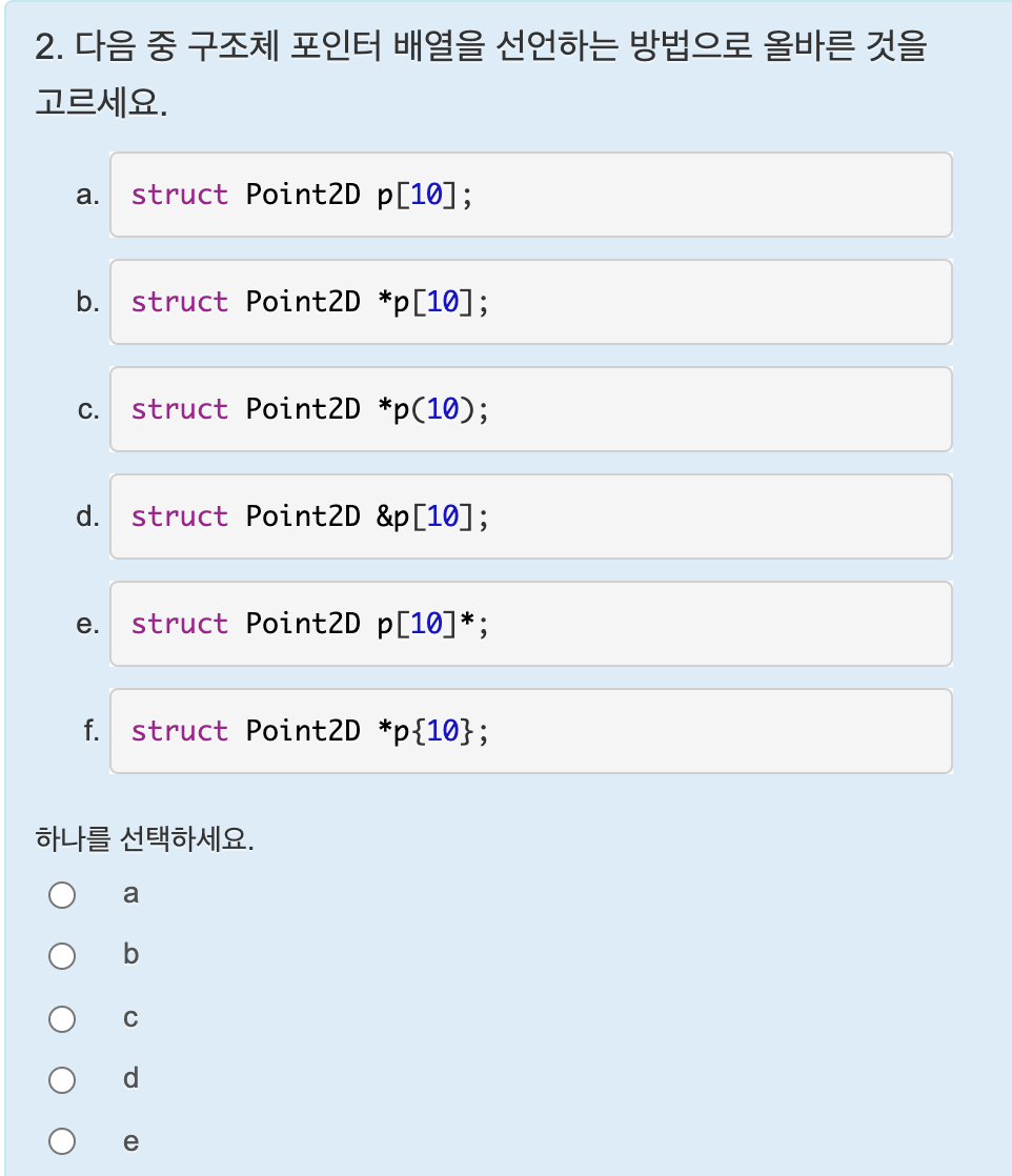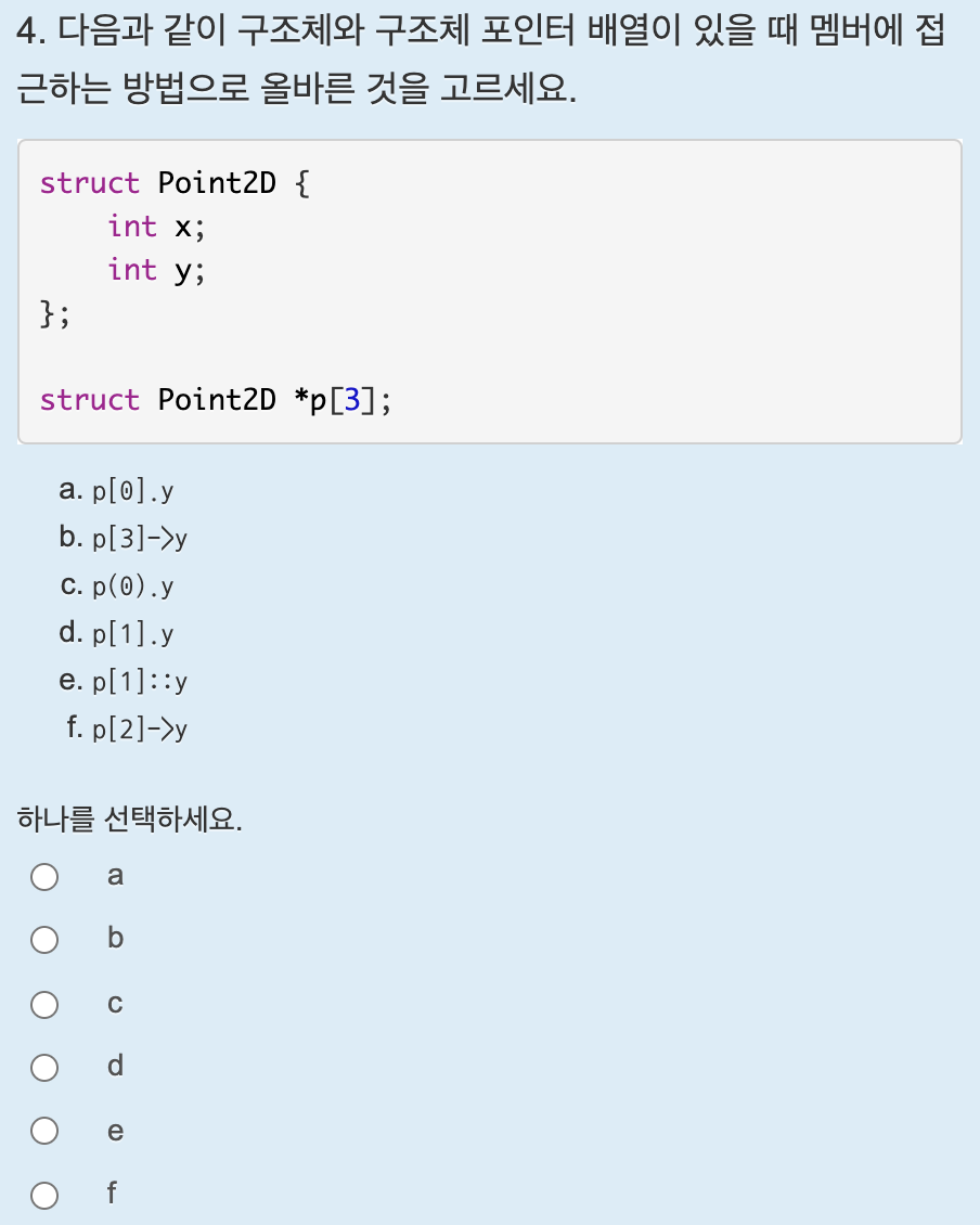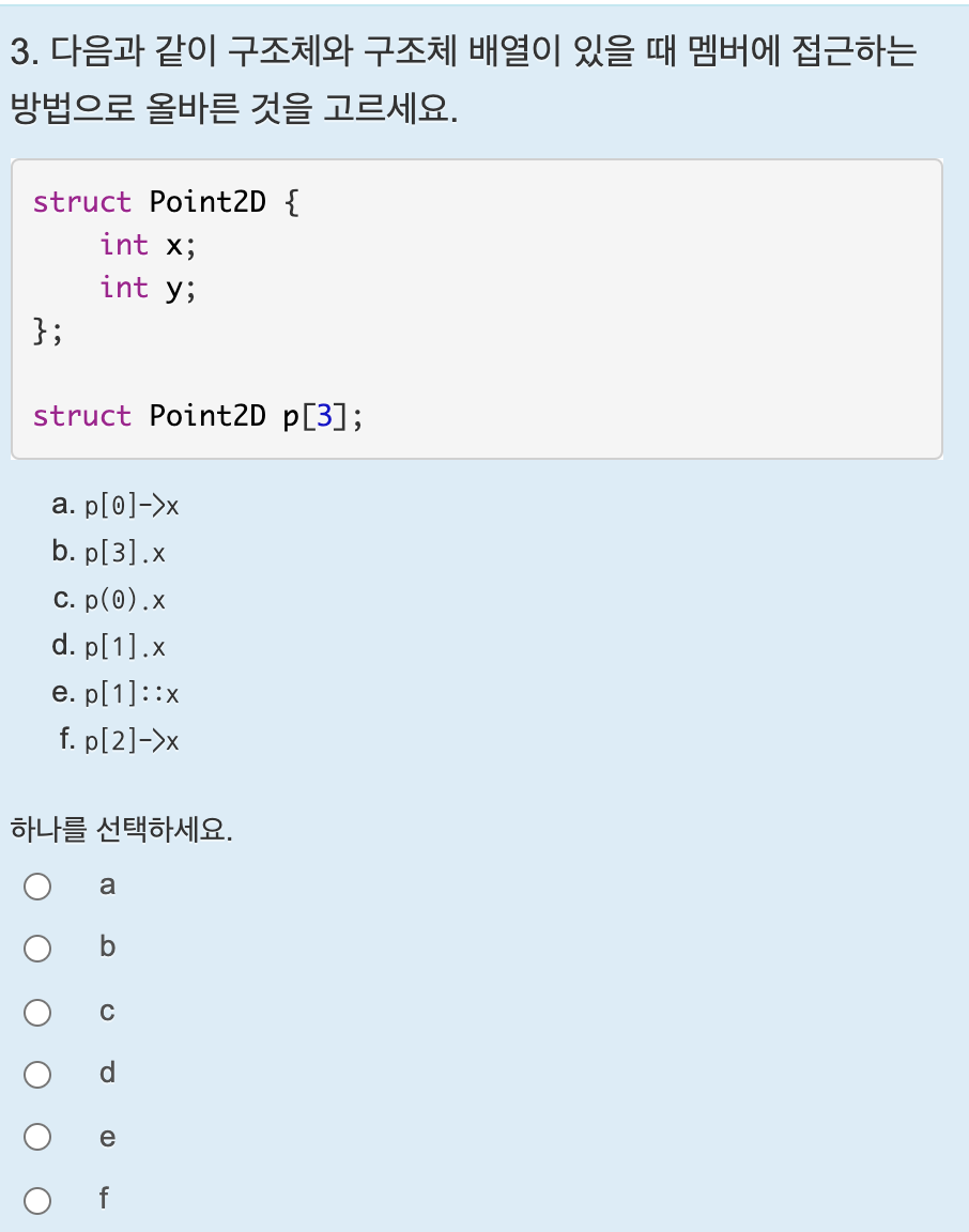 - struct구조체이름 변수이름[크기] = { { .멤버이름1 = 값1, .멤버이름2 = 값2 }, { .멤버이름1 = 값3, .멤버이름2 = 값4 } };