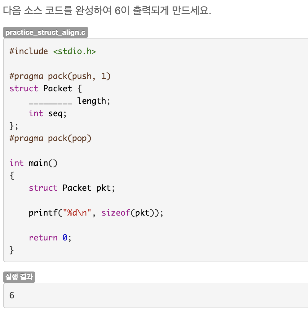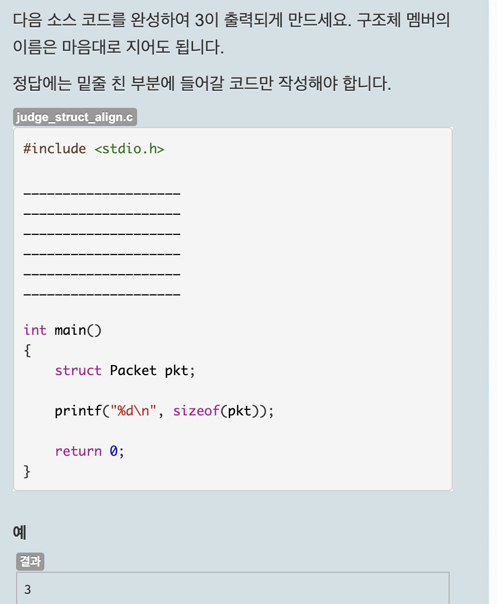 3이 출력되야 하므로 구조체 정렬 크기를 자료형에 맞게 조절하고, 1바이트인 char 자료형, 2 바이트인 short 자료형으로 멤버를 하나씩 만들면 된다.