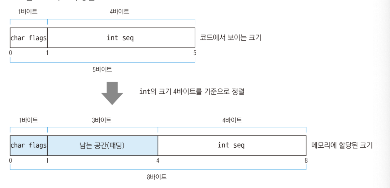 구조체의 크기를 구하려면 sizeof 연산자 안에 변수나 struct 키워드와 구조체 이름을 넣어주면 된다. PacketHeader 구조체 안에는 1바이트 크기의 char 변수와 4바이트 크기의 int 변수가 들어있어 전체 크기는 5가 나와야 할 것 같지만 8이 나왔다. C에서 구조체들을 정렬할 때는 멤버중에서 가장 큰 자료형 크기의 배수로 정렬한다. 위 구조체에서는 int가 가장 큰 자료형이므로 느끼는 4바이트를 기준으로 정렬하여 구조체 전체 크기는 8바이트가 되었다. 1바이트 크기인 char flags 뒤에는 4바이트를 맞추기 위해 남는 공간에 3바이트가 더 들어가게 되는데 이렇게 구조체를 정렬할 때 남는 공간을 채우는 것을 패딩이라고 한다.