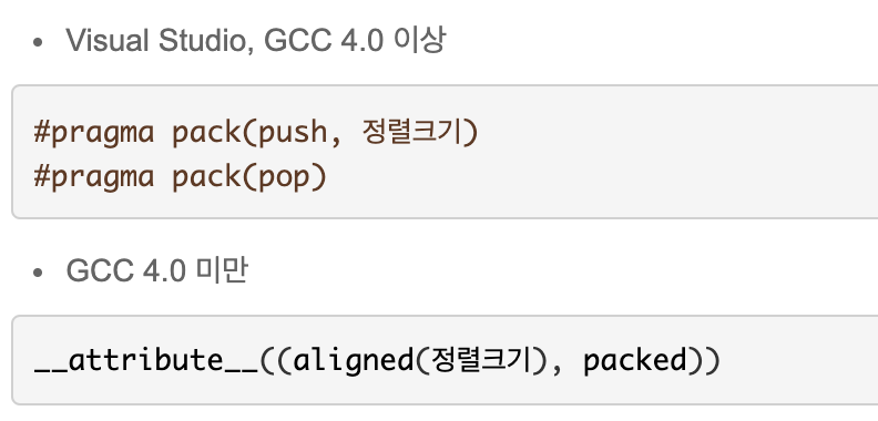 각 컴파일러에서 제공하는 특별한 지시자를 사용하여 구조체 정렬 크기를 조절할 수 있다.