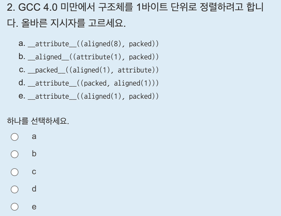 구조체를 정의할 때 위 아래로 #pragma pack(push, 1)과 #pragma pack(pop)을 넣었다. pack을 1로 설정하면 1바이트 단위로 정렬하여 남는 공간 없이 자료형 크기 그대로 메모리에 올라간다. #pragma pack(push, 1)을 한 번 사용하면 이후 모든 구조체에 영향을 주므로 정렬 한 뒤 #pragma pack(pop)를 사용하여 설정을 이전 상태로 되돌린다. 만약gcc버전이 4.0미만이면 __attribute__((aligned(1), packed))를 사용한다.