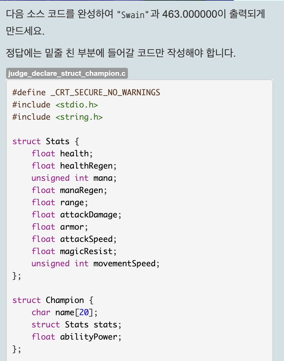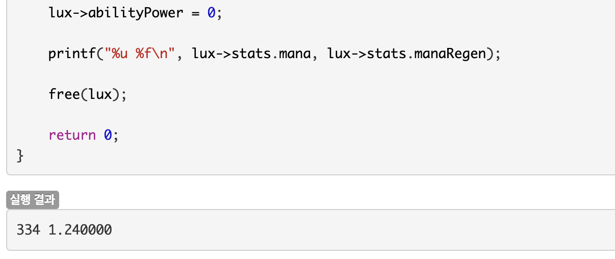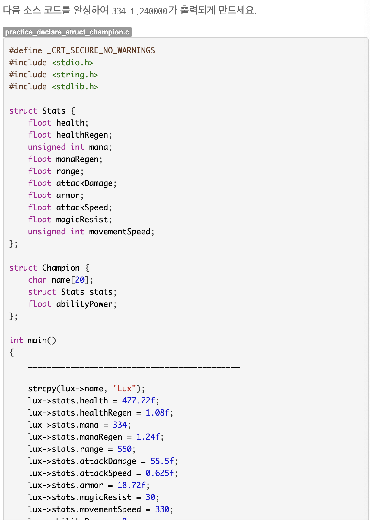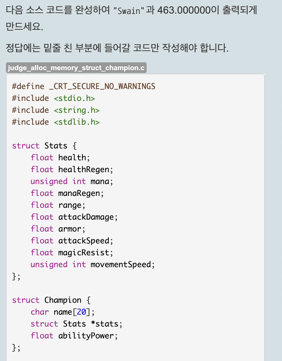 화살표 연산자로 접근하고 있기 때문에 포인터로 만들어서 메모리를 할당시켜줘야 하므로 정답은 struct Champion *lux = malloc(sizeof(struct Champion)); 이다.