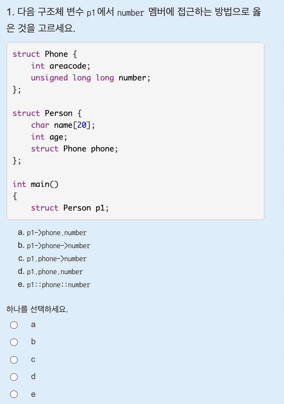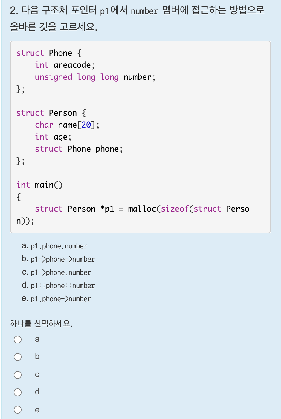 Person 구조체 안에는 구조체 포인터를 멤버로 갖고 있다. 먼저 바깥 구조체의 포인터에 메모리를 할당하고 멤버로 있는 구조체 포인터에 메모리를 할당해야 한다. 각 멤버에 접근하려면 p1은 포인터이고, 구조체 멤버 phone도 포인터이므로 화살표 연산자로 접근하면 된다. 구조체 포인터 사용이 끝나면 메모리를 해제해야 하는데, 안쪽에 있는 멤버부터 메모리를 해제해야 한다. 만약 바깥에 있는 구조체를 먼제 해제하게 되면 데이터가 사라져서 멤버에 더이상 접근할 수 없다. 멤버 포인터에 저장된 주소도 알 수 없기 때문에 해제도 할 수 없다. 그래서 ㅇㄴ쪽의 구조체 먼제 해제해야 한다.