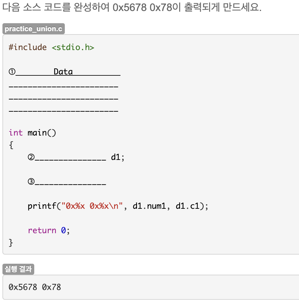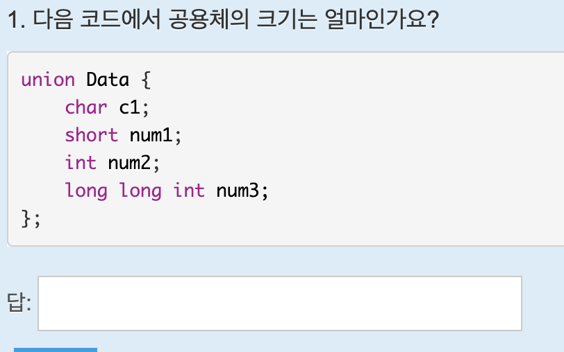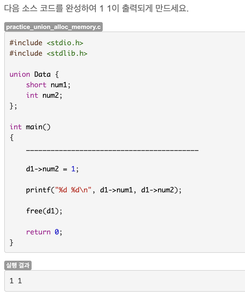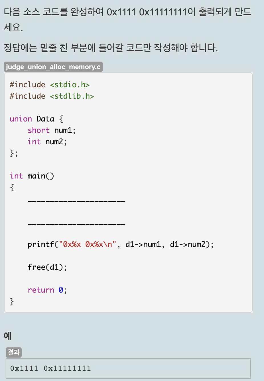 화살표 연산자가 사용됬기 때문에 포인터를 선언한 후 메모리를 할당해야 한다. 공용체는 가장 큰 자료형의 공간을 공유하므로 가장 큰 멤버에만 0x111111111을 넣으면 된다.