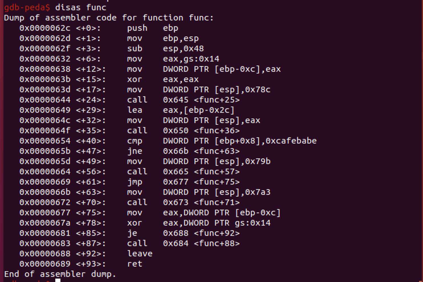 func + 40의 위치에서 func함수의 인자와 0xcafebabe를 비교하고 있다.